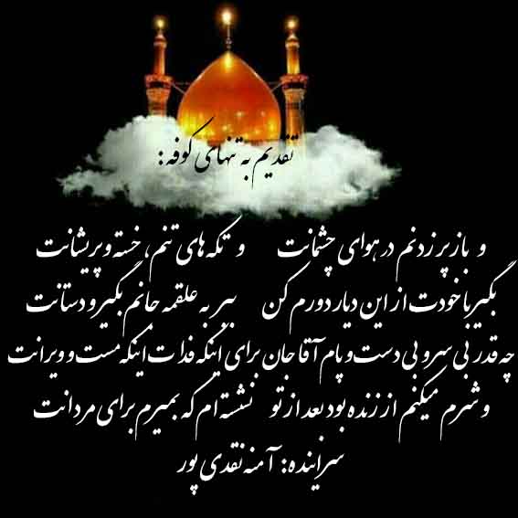 می شود هادی ِ هزاران دل، تا خدا را به هر یقین بـِبَرَد سامرا عاشقانه میخـوانـَد، تا که آوازه اش به چین بـِبَرَد نذر ِ دین میکـُنـَد وجودش را، "انفقت فی سبیل ِ حق" یعنی: زندگی در کـَفـَش گذاشته تا، خالصانه به راه ِ دین بـِبَرَد بین ِ القاب ِ"طیّب"و پاکش،"ناصح"و"مرتضی"و"عالم"را متصّل می کـُنـَم به جـَدّی که، سهم باید که از "امین" بـِبَرَد دست ِ مأمون گرفته معتز را، تا به کام ِ کسی شود دنیا دسته ای در تسلسل زَهرَند، زَهر باید به دل کمین بـِبَرَد سینه را شرحه شرحه می بینم، شرح ِ این اتفّاق را باید کوه ها را به لرزه اَندازَد، عرش را در کف ِ زمین بـِبَرَد مرتفع می شود زمینی که، خاندان ِ علی در آن دفن است تا بهشتی شود زمین بعدش، سهم از جنّة ِ برین بـِبَرَد سامرا مدفن ِ امام نقی، نور ِ چشم ِ تمام ِ انسانهاست هرکسی آرزو به دل دارد، پای ِدل را به این زمین بـِبَرَد شاعر: آمنه نقدی پور از کتاب معراج خون